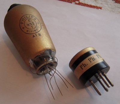 Diese alten Röhren sollten immer am Kunststoffsockel gezogen werden. Der Vorbesitzer hat wohl am Glaskolben gerissen, das Resultat sieht man links. Ich habe schon befürchtet die Röhre (E452T) sei defekt, was auch mit ein Grund dafür war, dass ich das Radio etwa 20 Jahre im Keller liegen liess. Ich habe mir damals eine Reparatur nicht zugetraut, und wusste auch nicht woher Ersatzteile zu bekommen.